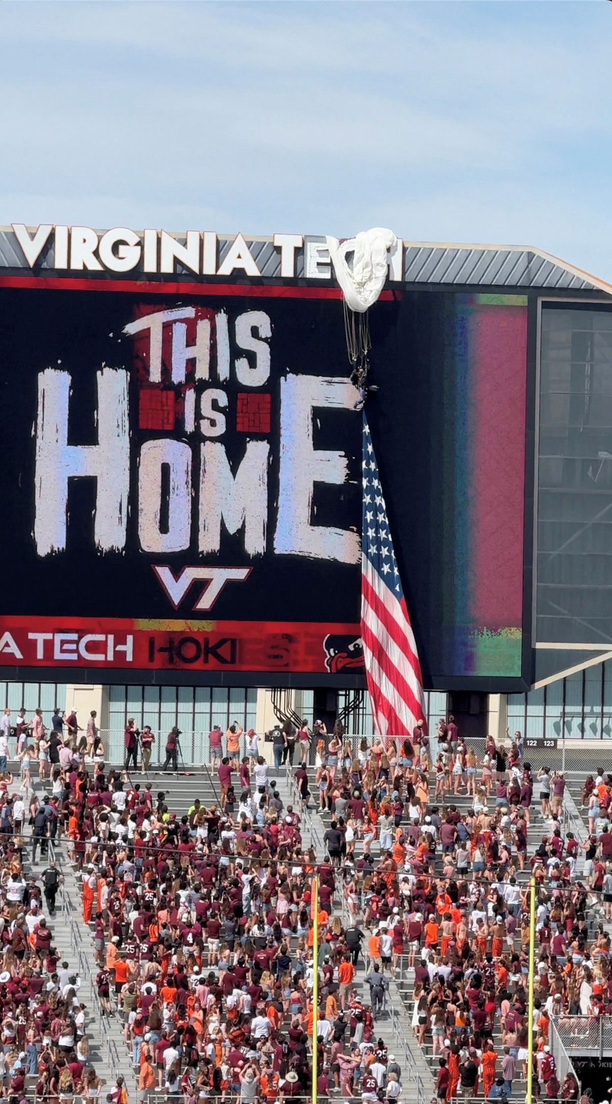 Zápasu místních Hokies, které proslavil i tradiční nástup k utkáním za hudby Enter Sandman od skupiny Metallica, předcházel seskok tří parašutistů.