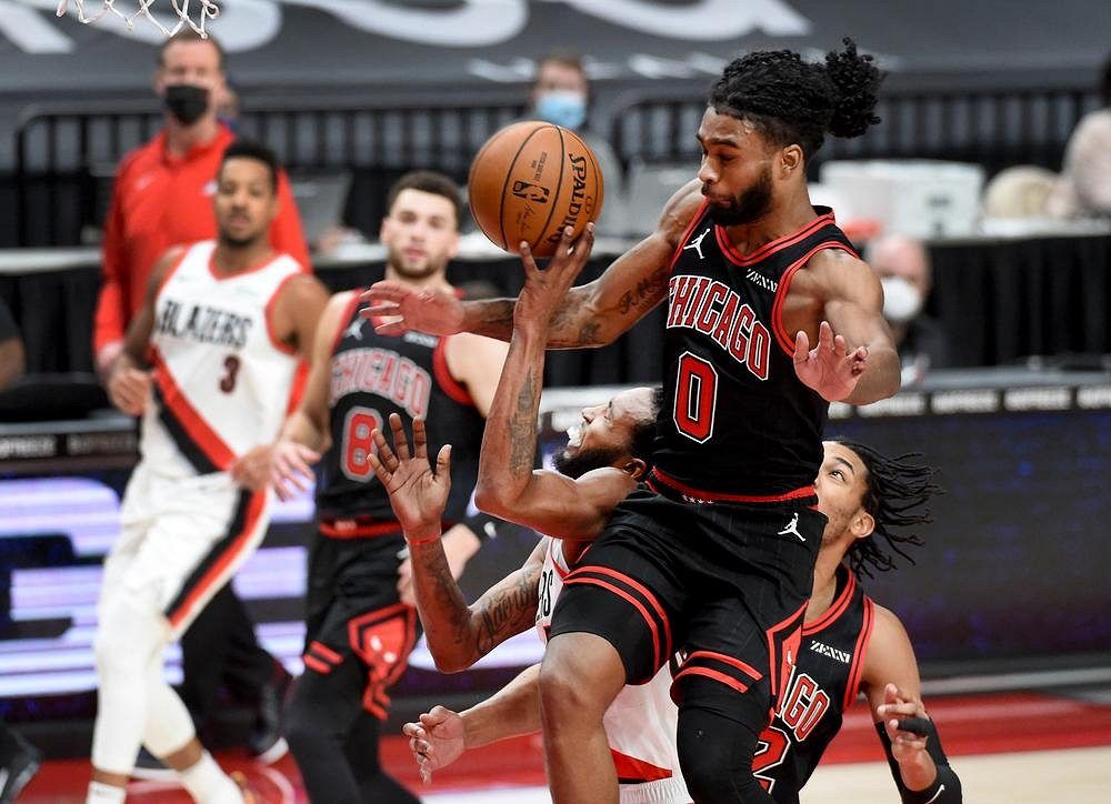 Basketbalisté Chicaga vyhráli v Portlandu a vybojovali čtvrté vítězství z posledních pěti utkání NBA. V akci je Coby White (0) z Chicaga, útok sleduje Harry Giles III z Portlandu.