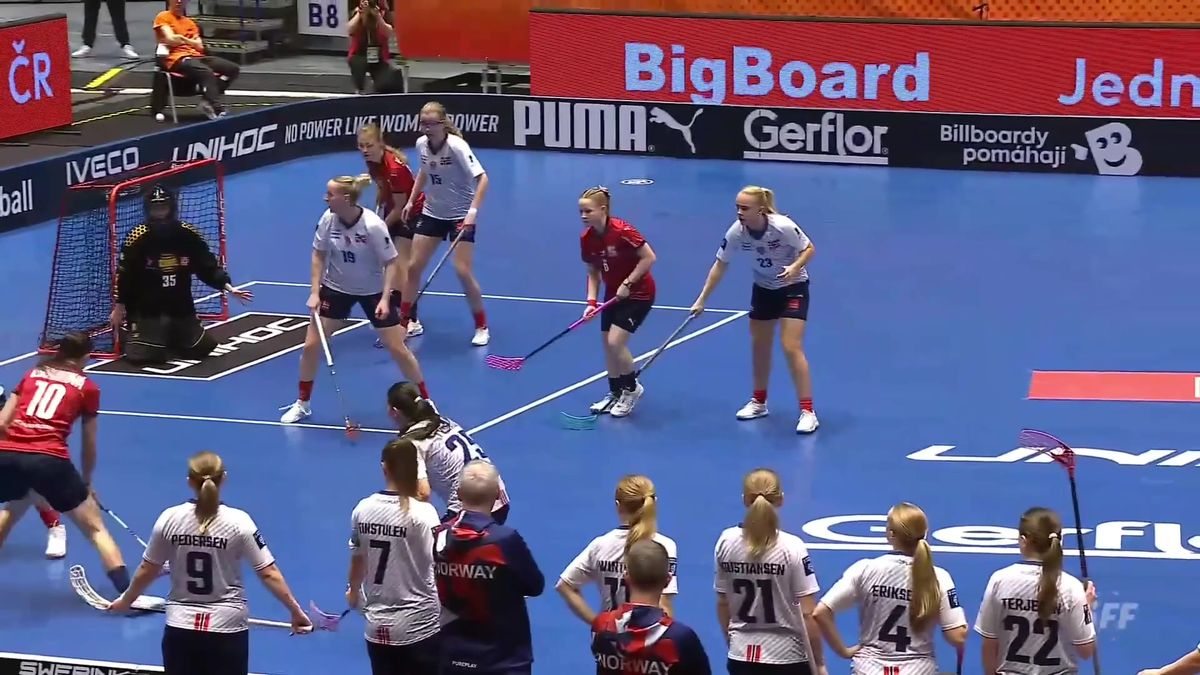 Úvodní čestné buly vhodili vodní slalomář Lukáš Rohan a cyklistka BMX Iveta Miculyčová. Norky odolávaly do poloviny úvodní třetiny, kdy za brankářkou Theou Kristine Ekholtovou skončila střela Jirákové od poloviny hřiště. Ve 29. utkání na světových šampionátech si obránkyně švédského Endre připsala jubilejní 10. trefu.