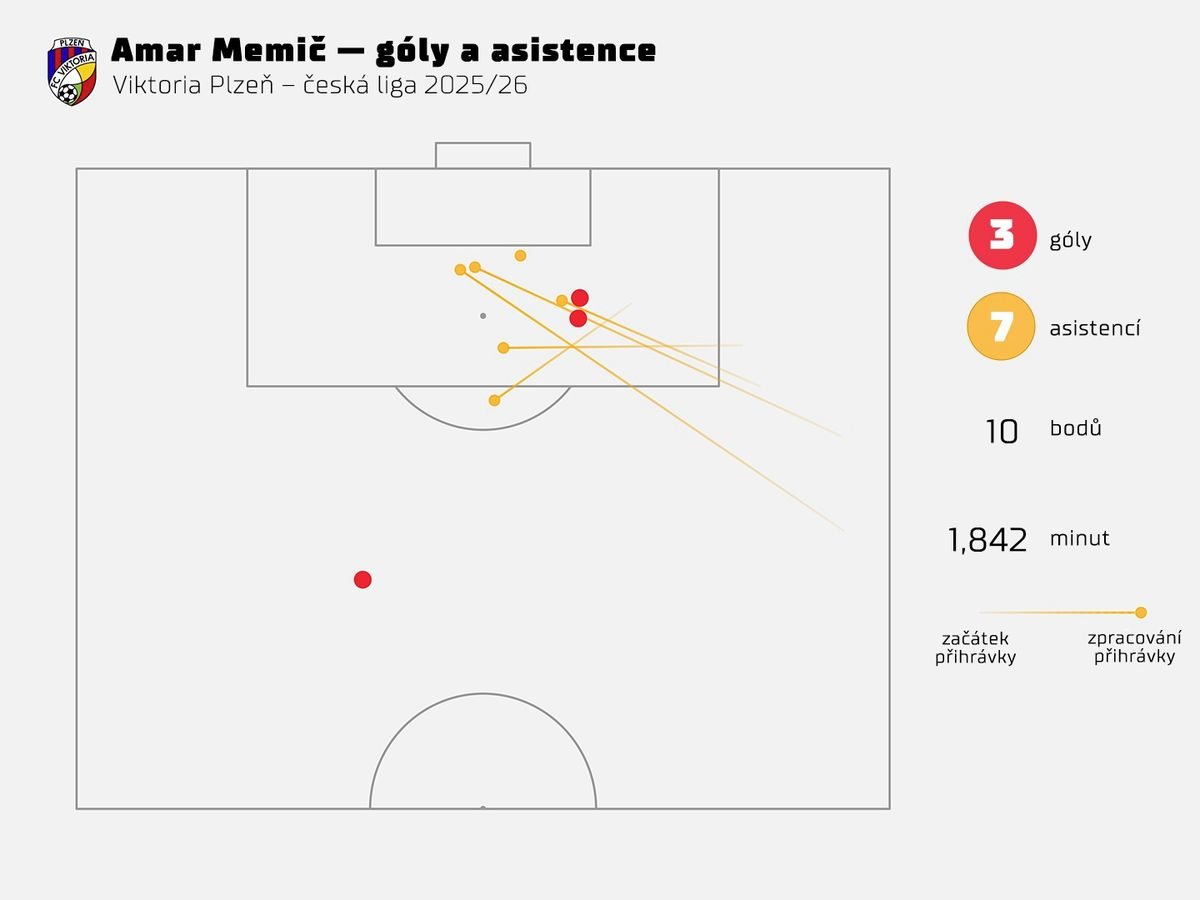 Memič v ligových zápasech vytvořil už 24 šancí, z přiložené grafiky je zřetelné, že různými způsoby. Centry z hloubi pole, kroucené mičudy od lajny, přízemní přihrávky směrem do ohně… V repertoáru opory Viktorie najdeme vše, co trenéři od lajnového hráče rádi vidí.