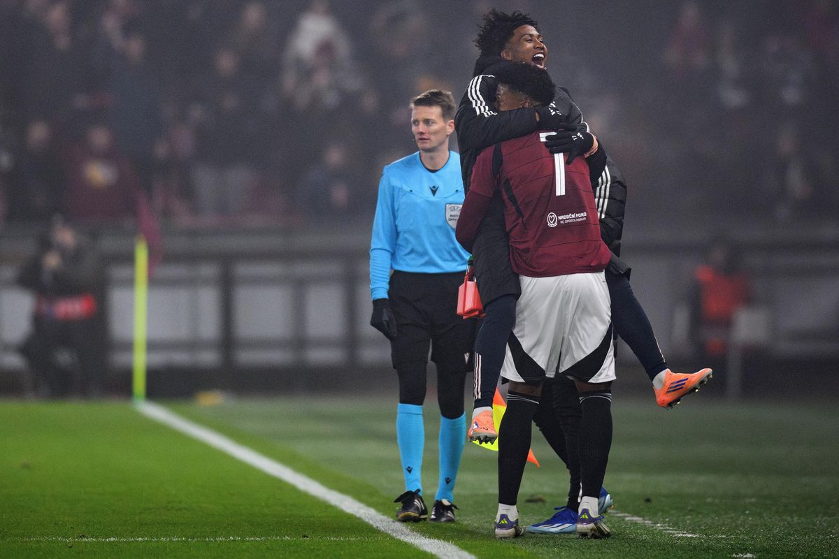 Angelo Preciado a John Mercado ze Sparty Praha oslavují gól na 1:0 během utkání Konferenční ligy s Aberdeenem.