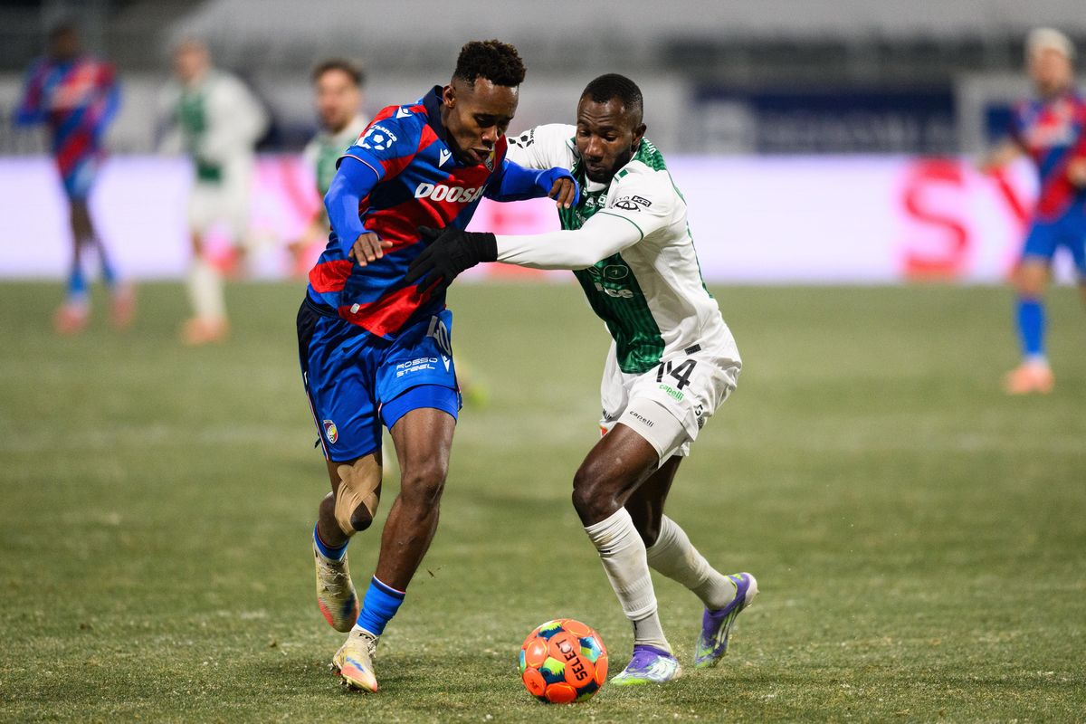 Sampson Dweh z Viktorie Plzeň a Lamin Jawo z Jablonce během utkání 16. kola Chance Ligy, FK Jablonec - FC Viktoria Plzeň, hrané 23. listopadu 2025 v Jablonci nad Nisou.