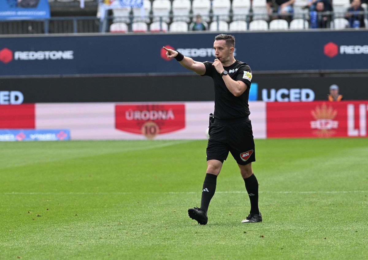 Hlavní sudí Dominik Starý nařizuje penaltu proti Slovácku.