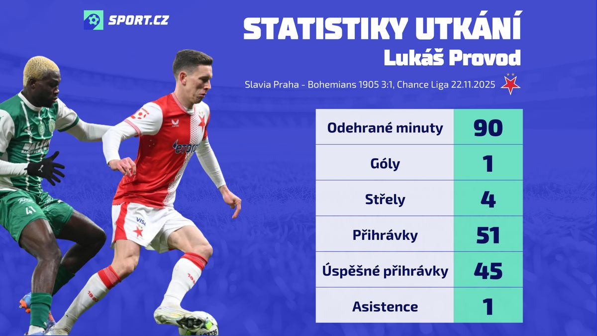Vybrané statistiky slávisty Lukáše Provoda z utkání s Bohemians dle dat společnosti Opta.