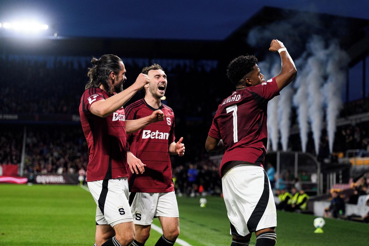 Sparty Praha zleva Jakub Martinec, Andrew Irving a John Mercado oslavují gól na 2:0 proti Karviné.