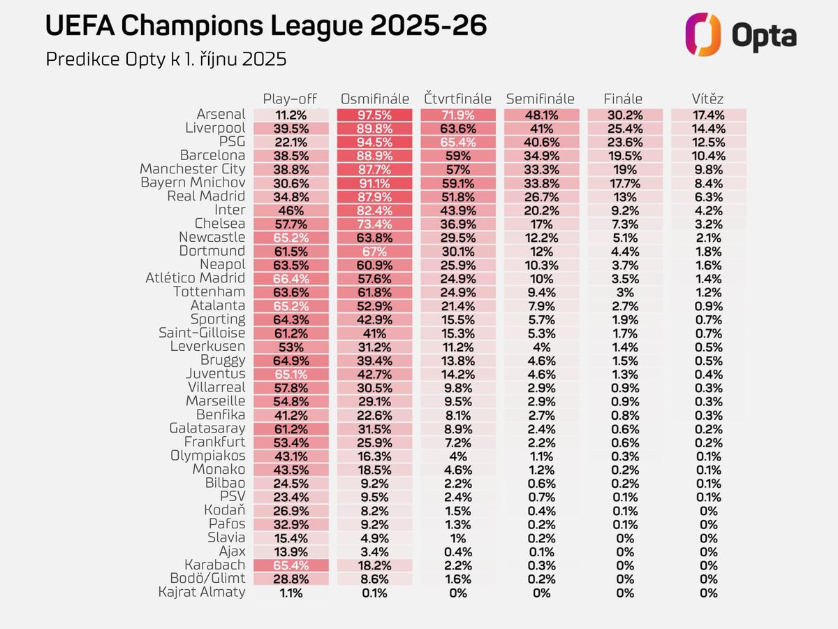 Predikce Ligy mistrů k po dvou odehraných kolech na základě dat společnosti Opta.