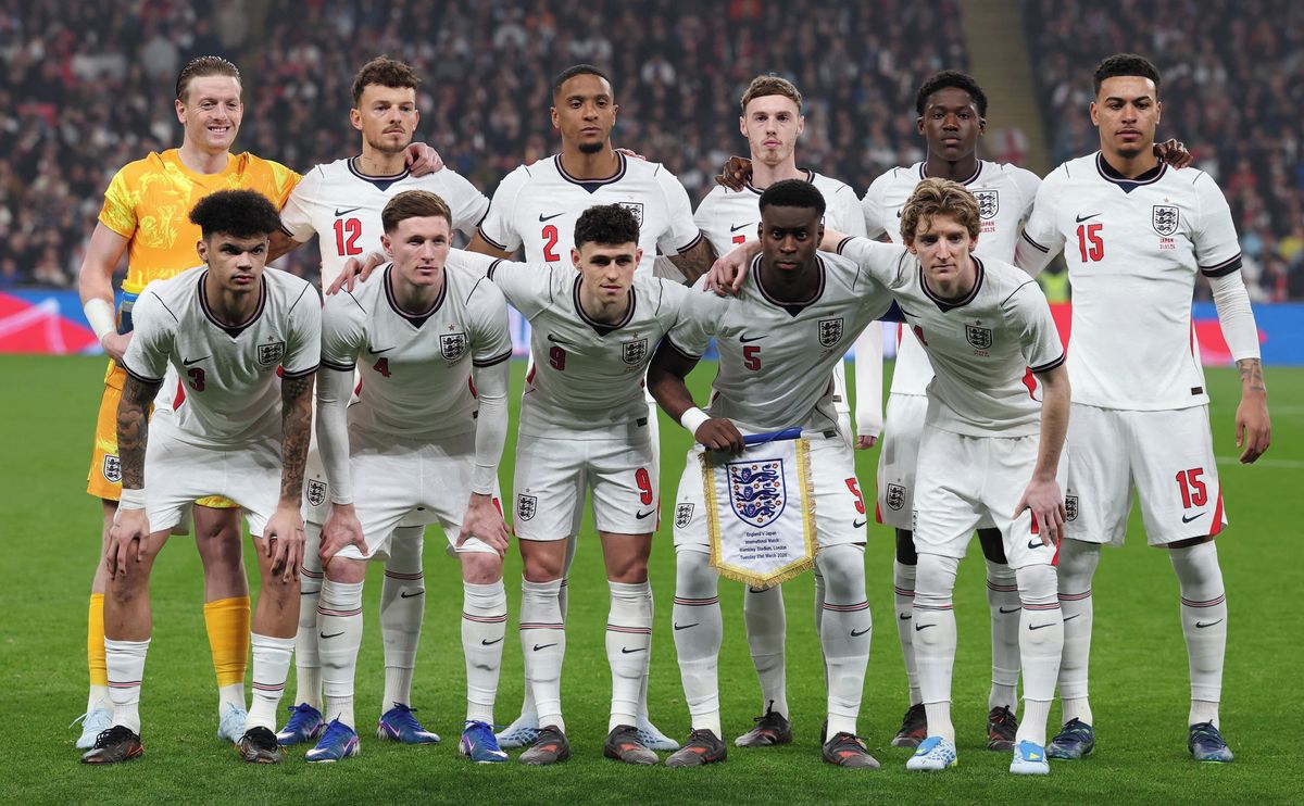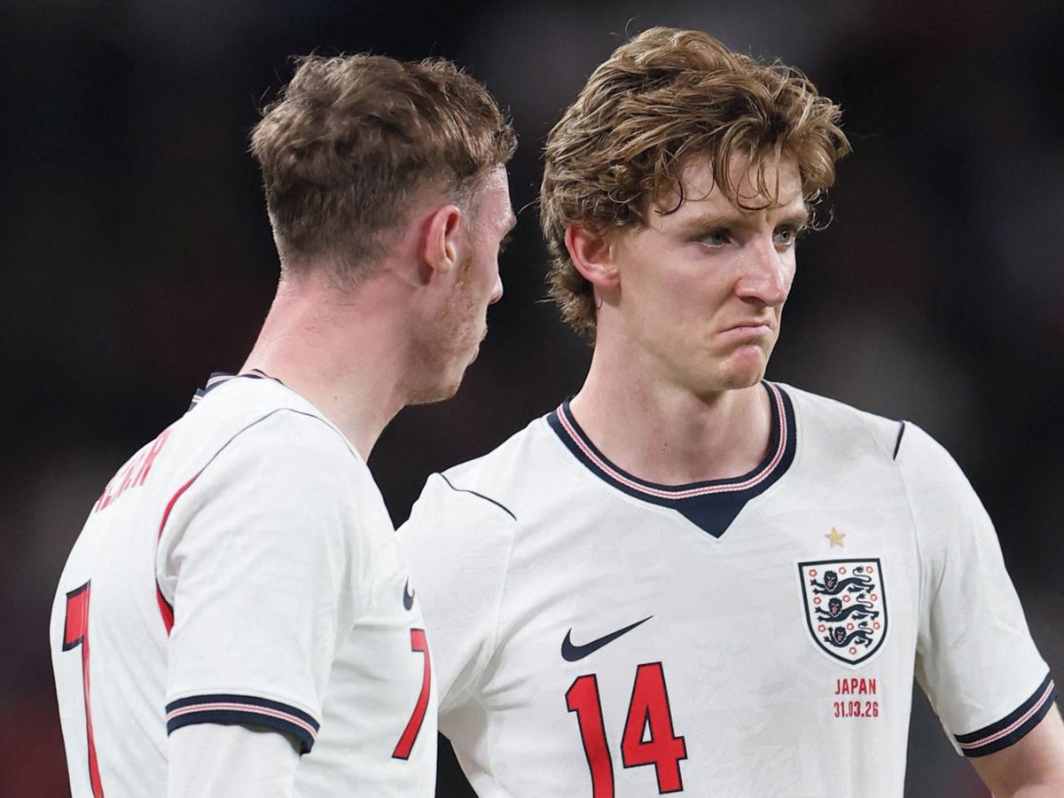 Angličané Cole Palmer a Anthony Gordon během přáteláku s Japonskem. Ani jim dresy neseděly.