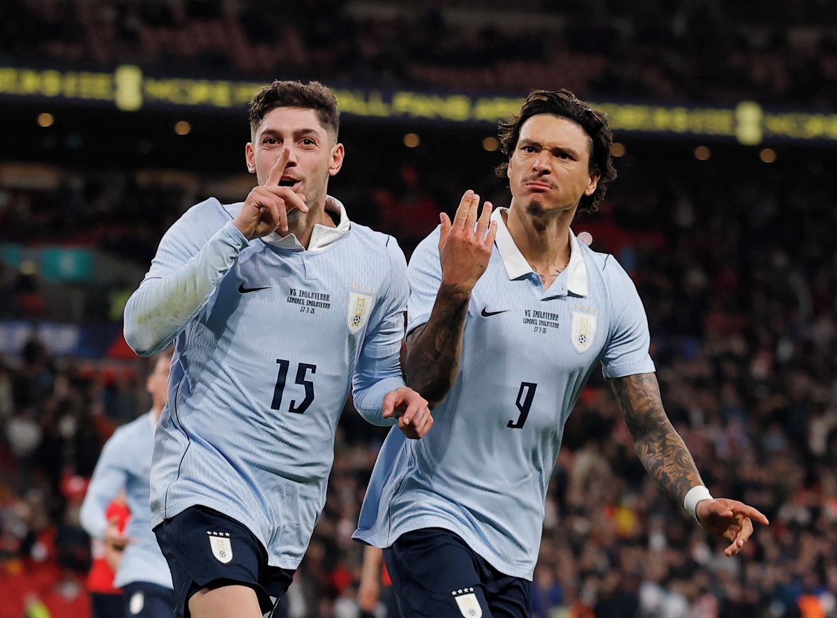 Uruguayci Federico Valverde a Darwin Núñez ve Wembley slavili bez ohledu na špatně ušité dresy.