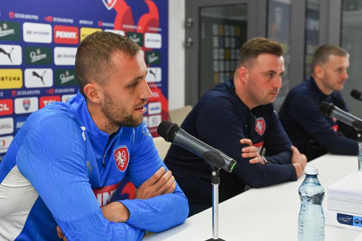 Tisková konference před přípravným fotbalovým utkáním Česko - San Marino. Na snímku zleva jsou kapitán týmu Tomáš Souček, hlavní trenér Jaroslav Köstl a mluvčí reprezentace Martin Bergman.