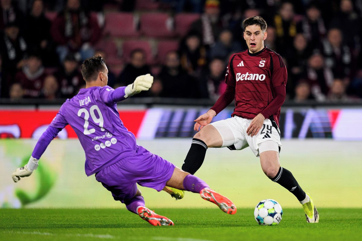 Matyáš Vojta ze Sparty Praha během utkání vyřazovací fáze UEFA Konferenční ligy s Alkmaarem.