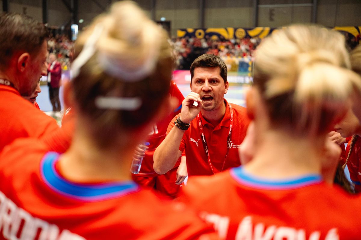 Trenér Tomáš Hlavatý při oddechovém času českých házenkářek.