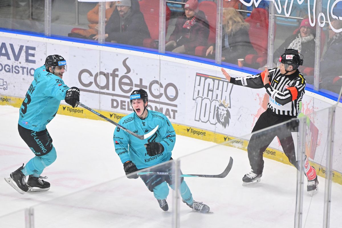 Matteo Kočí slaví branku na ledě Hradce.
