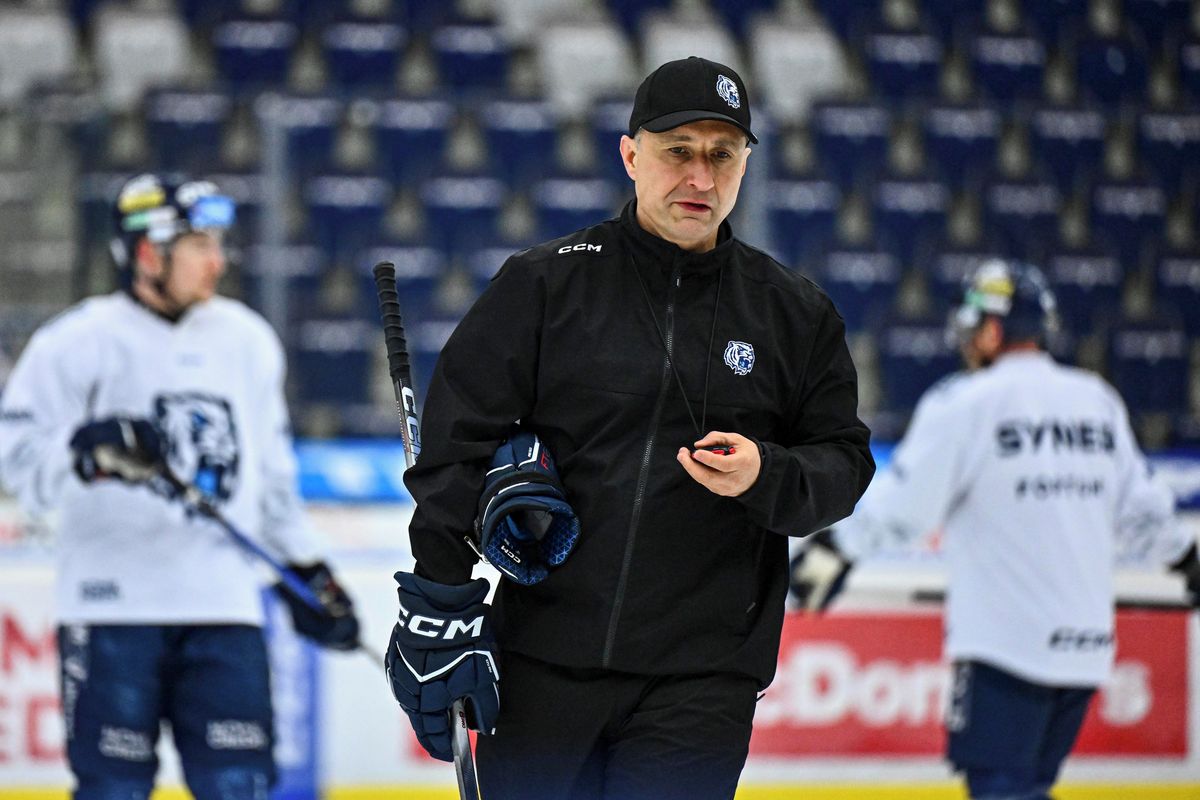 Trenér Jiří Kudrna na otevřeném tréninku hokejového týmu Bílých Tygrů před zahájením play-off.