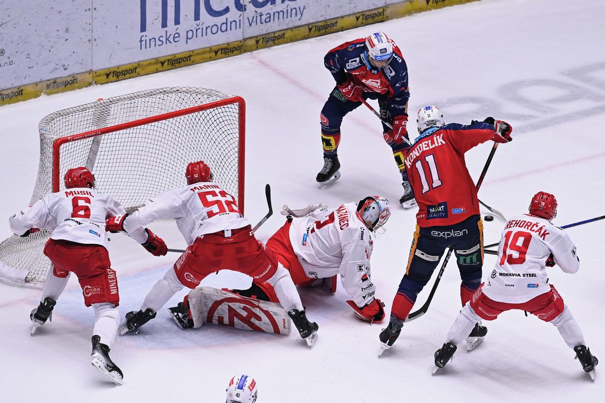 Situace před třineckou brankou těsně před druhým gólem Pardubic. Zakončující Lukáš Sedlák stojí nejdál.