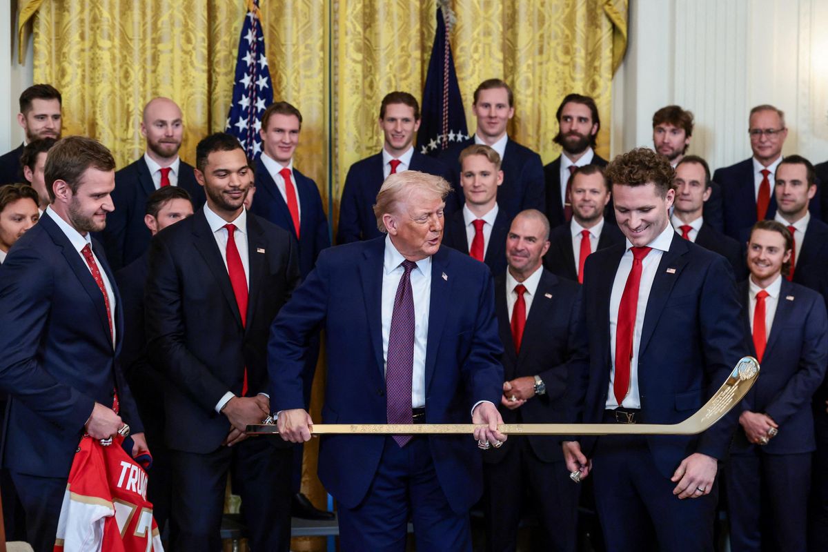 Trump se ujal slova u řečnického pultu a většinu přítomných narážkou na sousední stát rozesmál. „Zabránili jste Kanadě, aby získala Stanley Cup po 32 letech. Co si o tom myslíte, Maty,“ obrátil se Trump od pultíku s mikrofonem směrem k útočníkovi Matthewovi Tkachukovi.