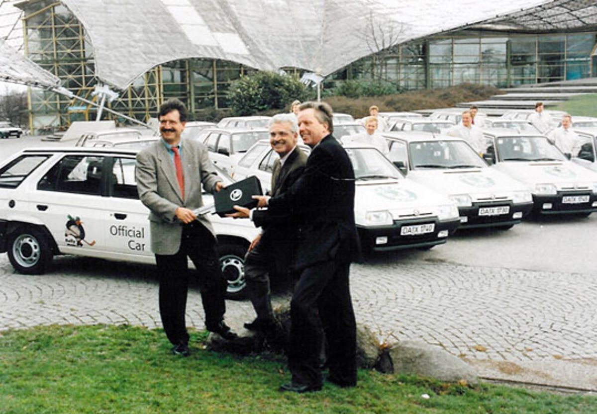 Zástupci Škoda Auto předávají organizátorům vozy na šampionátu 1993.