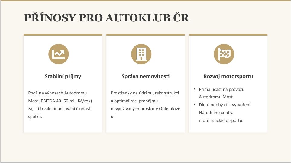 „Základem celé transakce je vytvoření společného podniku, který by vlastnil Autodrom Most a náš klubový dům. Ten by byl následně rekonstruován z výnosů tohoto podniku. Autodrom Most bychom chtěli dále rozvíjet s ohledem na potřeby a budoucnost našeho sportu, obecného motorismu, výchovy talentů a pořádání sportovních podniků nejen v okruhových disciplínách, ale i v dalších, kde se nám nedostává odpovídajících sportovišť,“ uvádí Šťovíček v dopise delegátům.