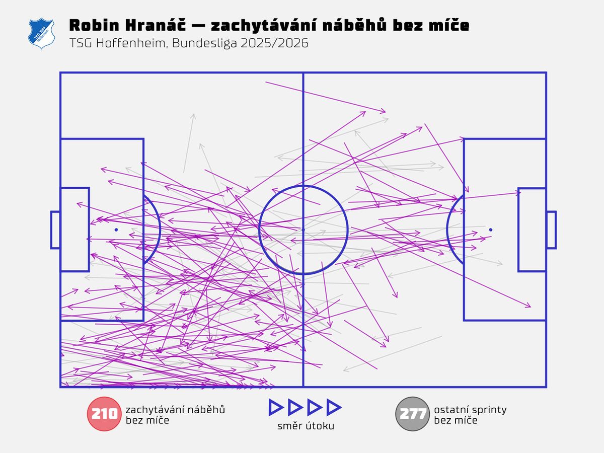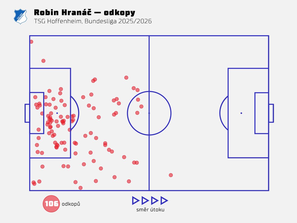 Rychlé reakce pak Hranáč používá při těsném bránění, díky nim se totiž dostal už ke 106 odkopům. V bundeslize jich nasbíralo víc jen šest plejerů. Mezi nadprůměr se podle dat Opty řadí i v obranných zákrocích, zachycených přihrávkách a zablokovaných střelách.