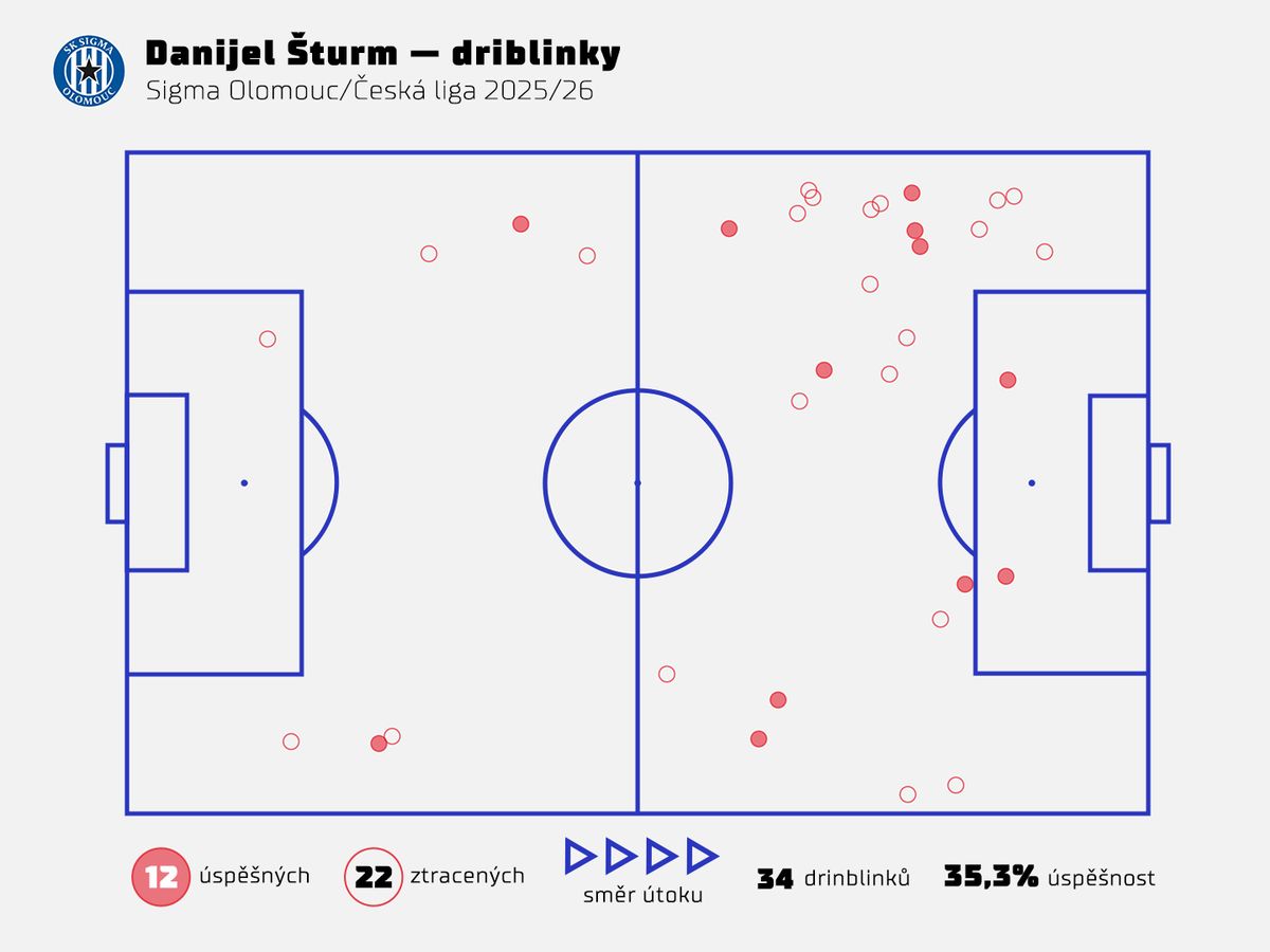 Jeho aktivitu zachycuje i snaha o driblinky při obcházení soupeřů. Je to jeho další jasný charakteristický rys. Za 90 minut se pokusí průměrně o 5,8 driblinku, v této statistice je výraznější pouze jablonecký Singhateh (6,2 driblinku na 90 minut). Nicméně Šturma v tomto směru poněkud sráží úspěšnost, kterou má u driblinků jen 35,3 %.