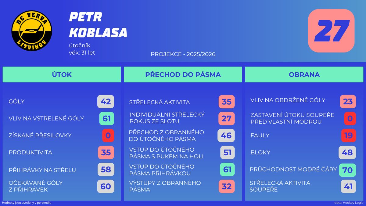 Najít důvody neúspěchu je u Vervy snadné. Podíl očekávaných gólů, který vyjadřuje, jak moc týmy hru kontrolují, má nejhorší ze všech (37,6). Znamená to, že Litvínov je často pod tlakem. Z toho samozřejmě pramení propustnější defenziva, proti které si zbytek ligy připraví 3,1 očekávaného gólu na 60 minut hry (druhé nejhorší číslo).