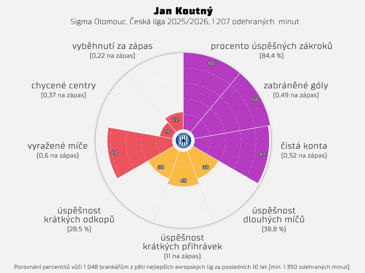Podle datového modelu Opta měl Koutný v soutěžních duelech aktuální sezony inkasovat 13,4 branky. Brankář Olomouce však v průměru zabránil 6,4 gólům. Lepší číslo má v nejlepších deseti evropských soutěžích pouze Stijn van Gassel z Excelsioru Rotterdam (7).