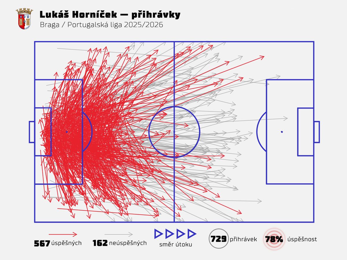 Přehled přihrávek Lukáše Horníčka z Bragy v sezoně 2025/2026 dle dat společnosti Opta (k 5.2.2026).