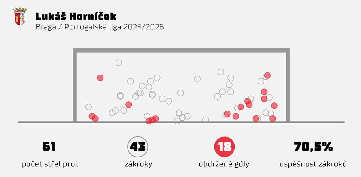 Přehled zákroků a obdržených gólů Lukáše Horníčka z Bragy v sezoně 2025/2026 dle dat společnosti Opta (k 5.2.2026).