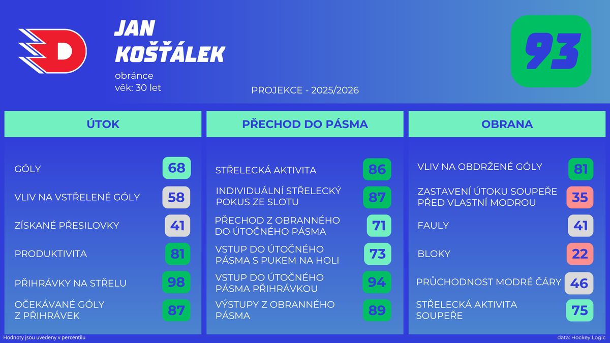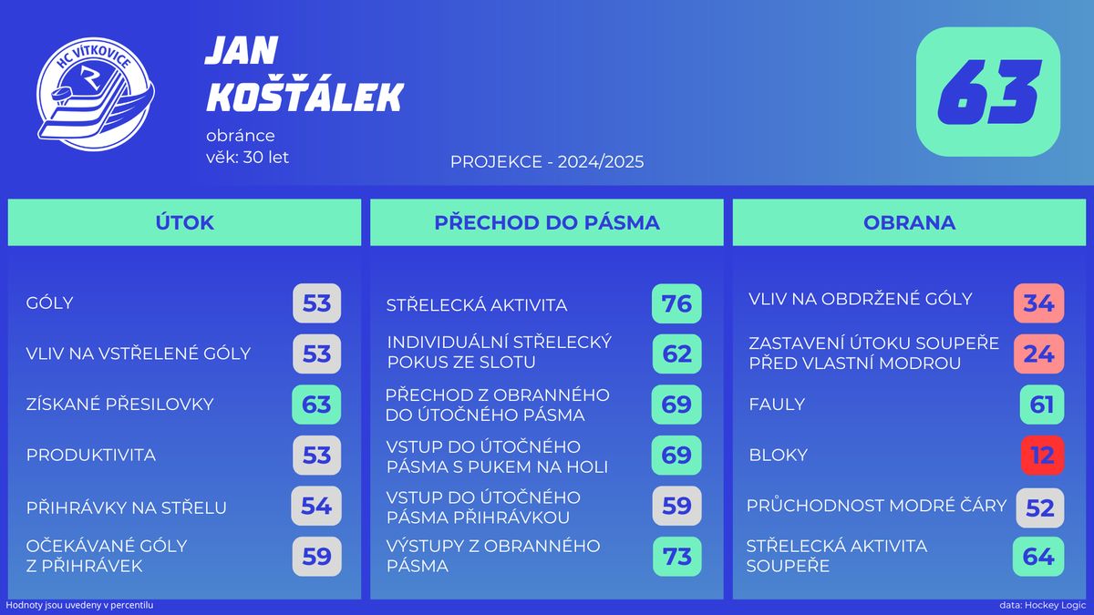 Pokročilá data Jana Košťálka za minulou sezonu ve Vítkovicích, hodnoty jsou uvedeny v percentilu.