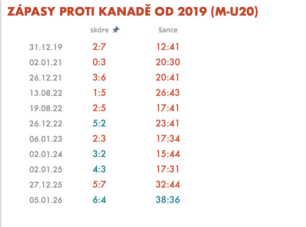 Že může česká dvacítka porazit stejně staré kanadské kolegy, si speciálně za oceánem bolestně pamatují. Nestalo se to poprvé. Ale ruku na srdce - většina dřívějších hrdinských výher proti favoritům měla klasickou antickou zápletku Davida s Goliášem a byla vykoupena špičkovým výkonem brankářů a vysokou efektivitou v útoku.