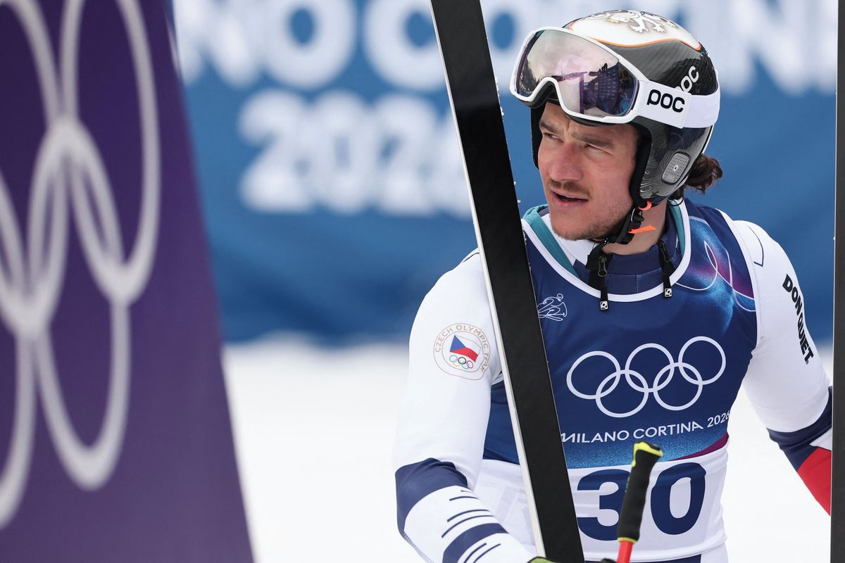 Český reprezentant Jan Zabystřan v cíli olympijského sjezdu.