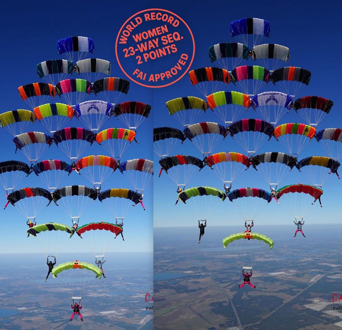 Skupina zkušených parašutistek dokázala vytvořit formace, které dosud žádný ženský tým neprovedl, a posunula tak hranice koordinace, přesnosti i odvahy. Nejzásadnějším se stal nově ustanovený světový rekord hromadného seskoku 23 parašutistek, při kterém měly v přesně načasovaných okamžicích dvakrát změnit formaci neboli obrazec při otevřených padácích.