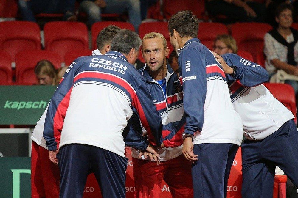 Roman Jebavý (uprostřed) v obležení kolegů z daviscupového týmu během baráže v Nizozemsku.