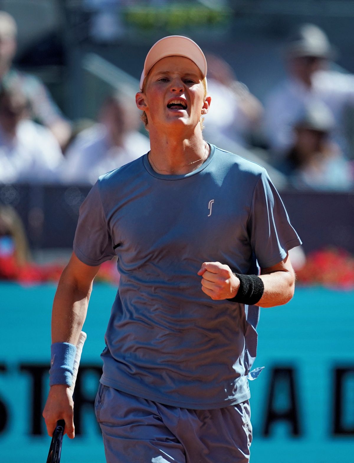 Elmer Moller’s racquet slips out of his hand after his serve against Jannik Sinner in Madrid