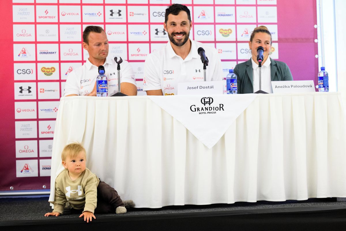 Tisková konference Josefa Dostála, Anežky Paloudové a trenéra Pavla Davídka měla netradičního hosta.