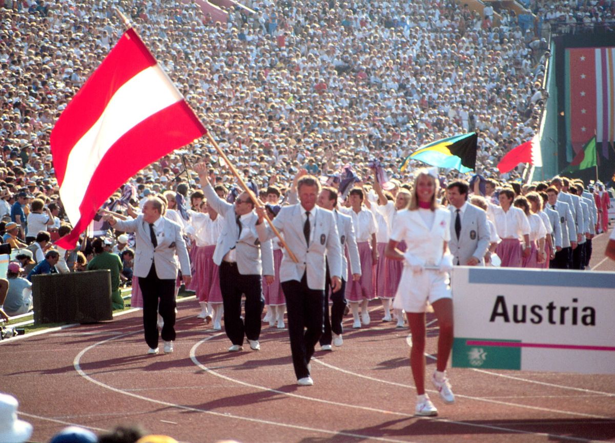 Hubert Raudaschl jako vlajkonoš rakouské výpravy v LA 1984.