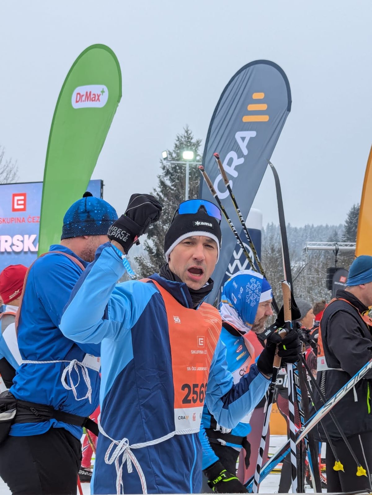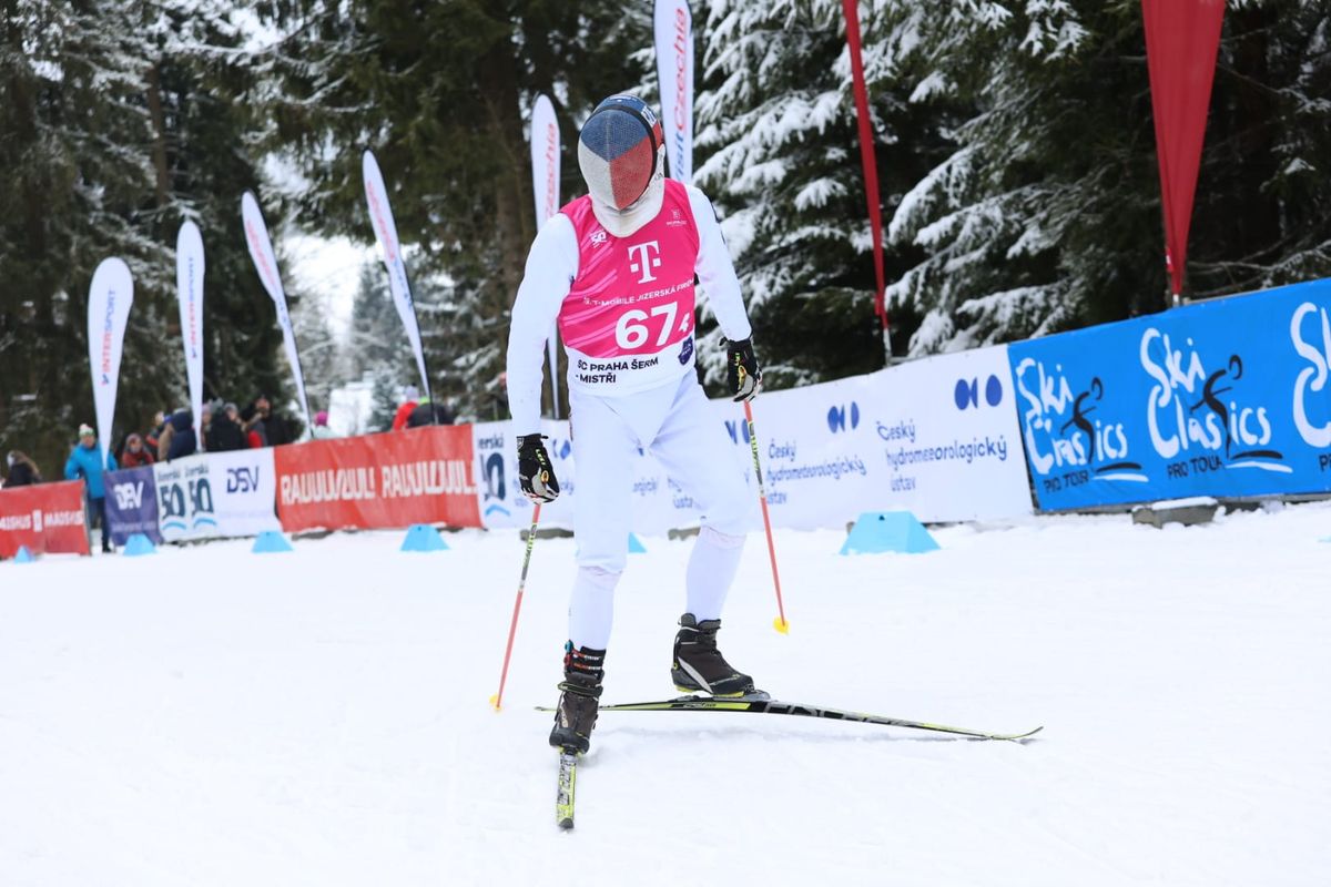 Kdyby člověk potrénoval, tak by to asi nějak odklouzal. Ale ono se to nezdá, ale maska na hlavě má dvě kila. A mít šest hodin na hlavě masku, kterou by si navíc musel asi kvůli smrkání v té zimě neustále sundávat a nandávat, by asi nebylo nic moc. Navíc je v tom blbě vidět. A pokud trochu vysvitne slunce, není vidět vůbec. Není vidět pořádně stopa, jen matně lidi nebo stromy kolem. I během štafety jsme s tím v některých úsecích měli problém. Takže na padesátku by to nebylo ono. (usměje se)