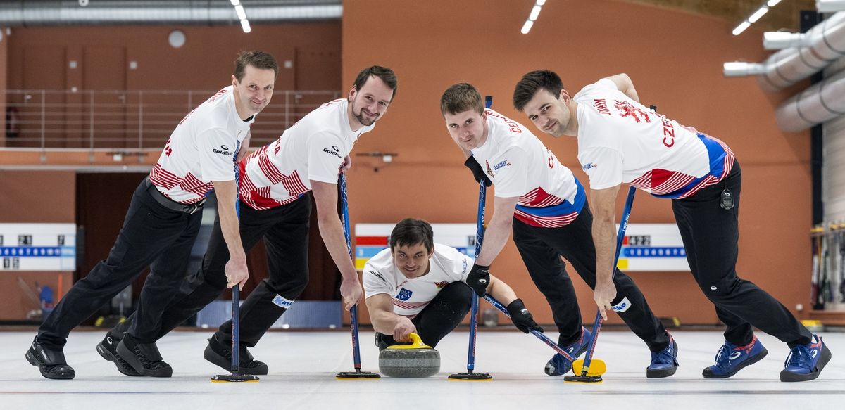 Česká mužská curlingová reprezentace. Zleva Radek Boháč, Lukáš Klípa, skip Lukáš Klíma, Marek Černovský a Martin Jurík.