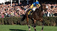 Žokej Jan Faltejsek na koni Tzigane Du Berlais oslavuje vítězství v dostihovém závodu 128. Velká pardubická.